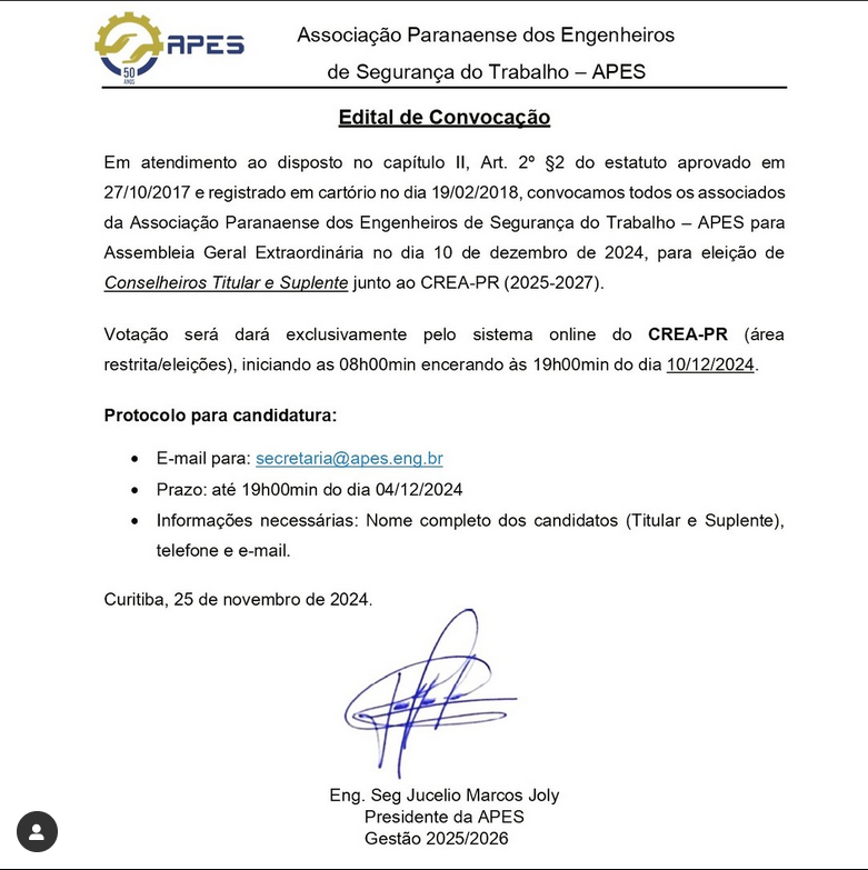 A Associação Paranaense dos Engenheiros de Segurança (APES) convoca todos os associados para participar da Assembleia Geral Extraordinária, que ocorrerá no dia 10 de dezembro de 2024, com o objetivo de eleger os novos Conselheiros Titular e Suplente para representação junto ao CREA-PR no período de 2025-2027.