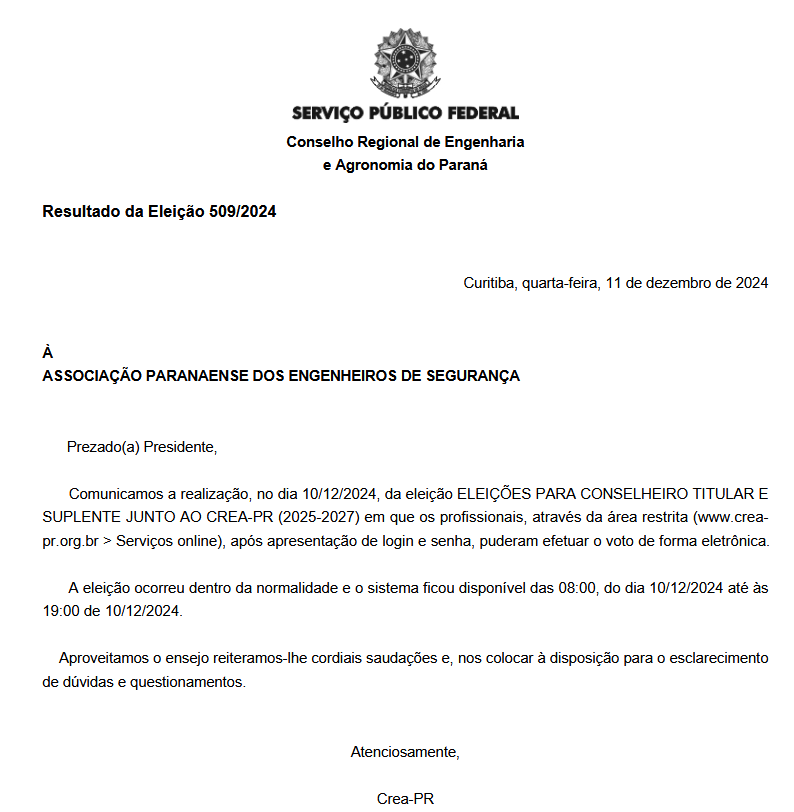 No dia 10 de dezembro de 2024, foi realizada a eleição para a escolha dos Conselheiros Titular e Suplente que representarão a Associação Paranaense dos Engenheiros de Segurança (APES) no Conselho Regional de Engenharia e Agronomia do Paraná (CREA-PR) no triênio 2025-2027. A votação foi realizada de forma eletrônica, através da área restrita no site do CREA-PR, garantindo acessibilidade e praticidade aos eleitores.